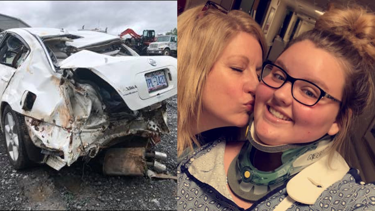 A mulher não sabia que sua filha havia se envolvido em um grave acidente de carro, e estava presa nas ferragens após seu veículo ter despencando em um aterro. O acidente "sacudiu meu carro três vezes, e eu caí no banco de trás com o braço preso entre o carro e o chão", escreveu Macy no Facebook.